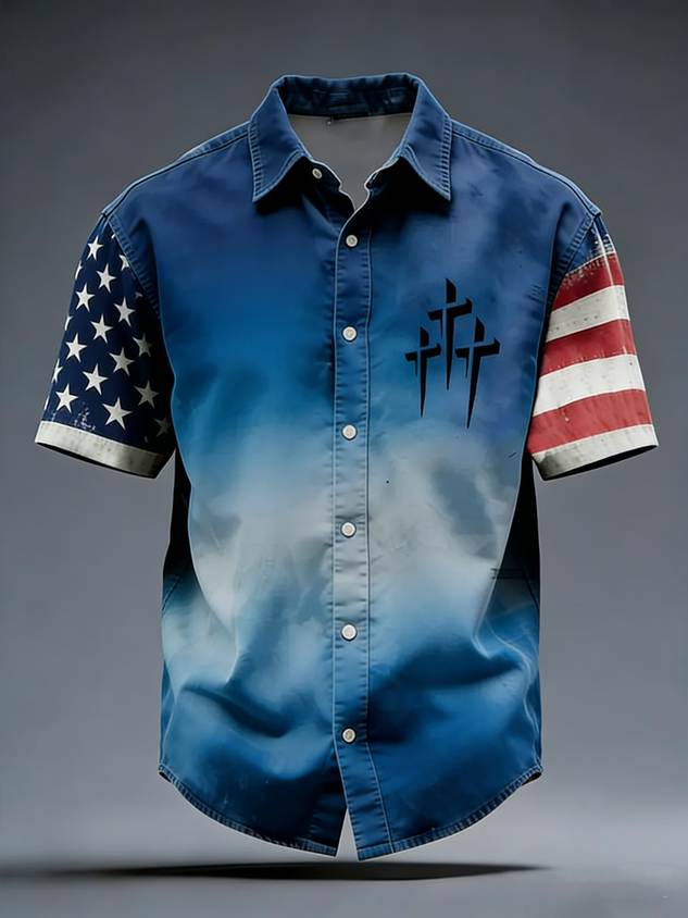 Moisture Wicking American Independence Day Flag American Faith Cross Chest Pocke Holiday Hawaiian Shirt