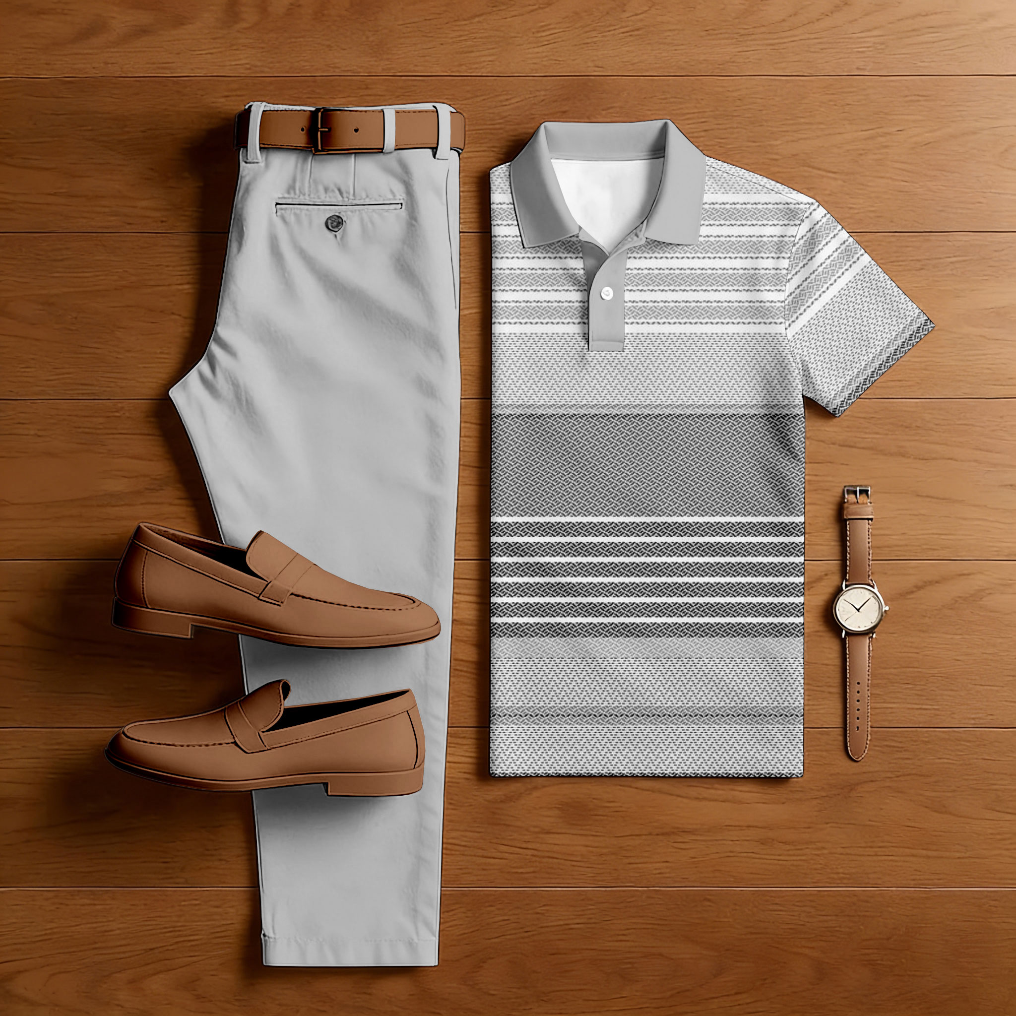 Men's Casual Gray Color Matching Printed Short Sleeved Polo Shirt & Trousers Two-Piece Set