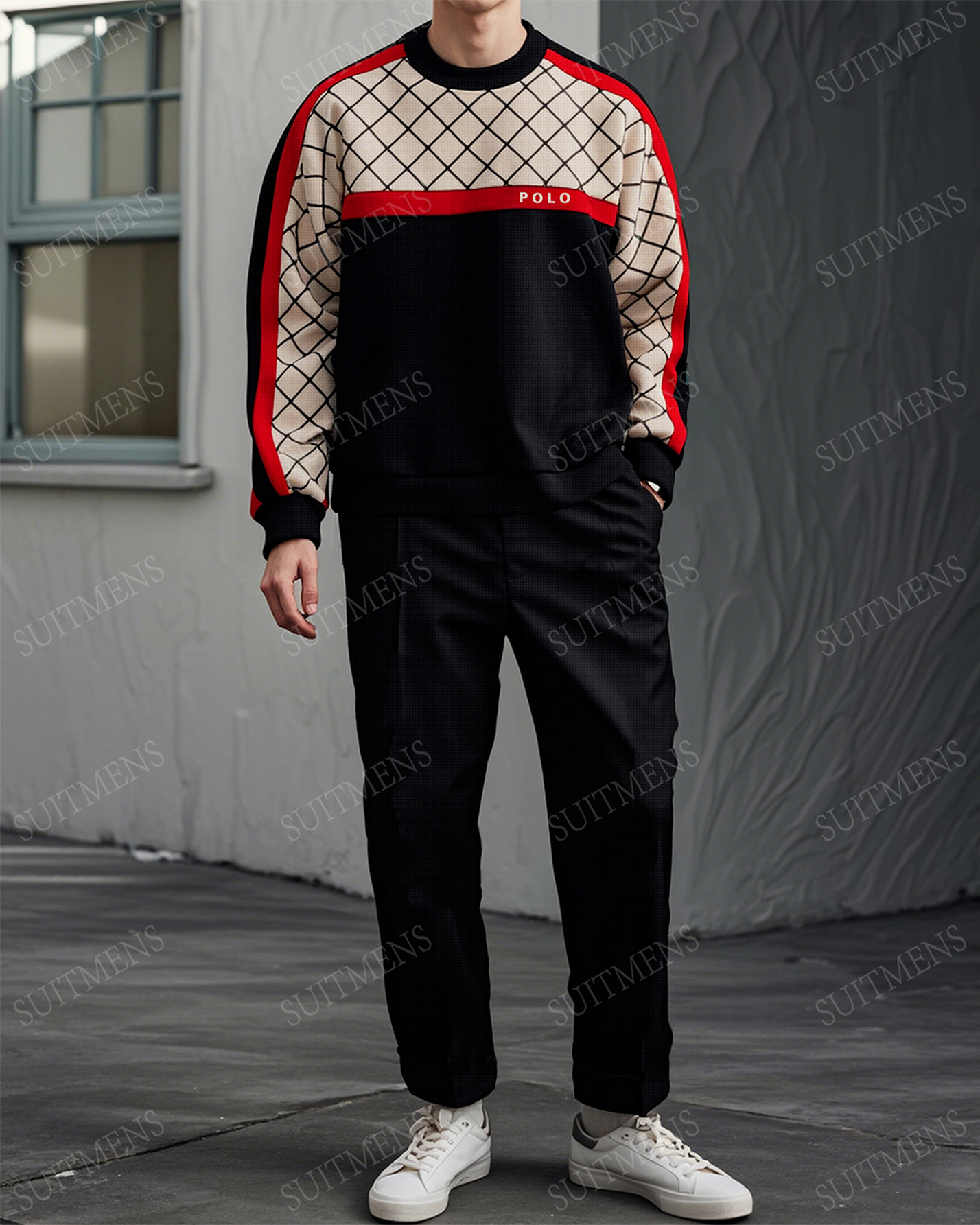 Men's New Colorblock Print Textured Long Sleeve Pants Set 001