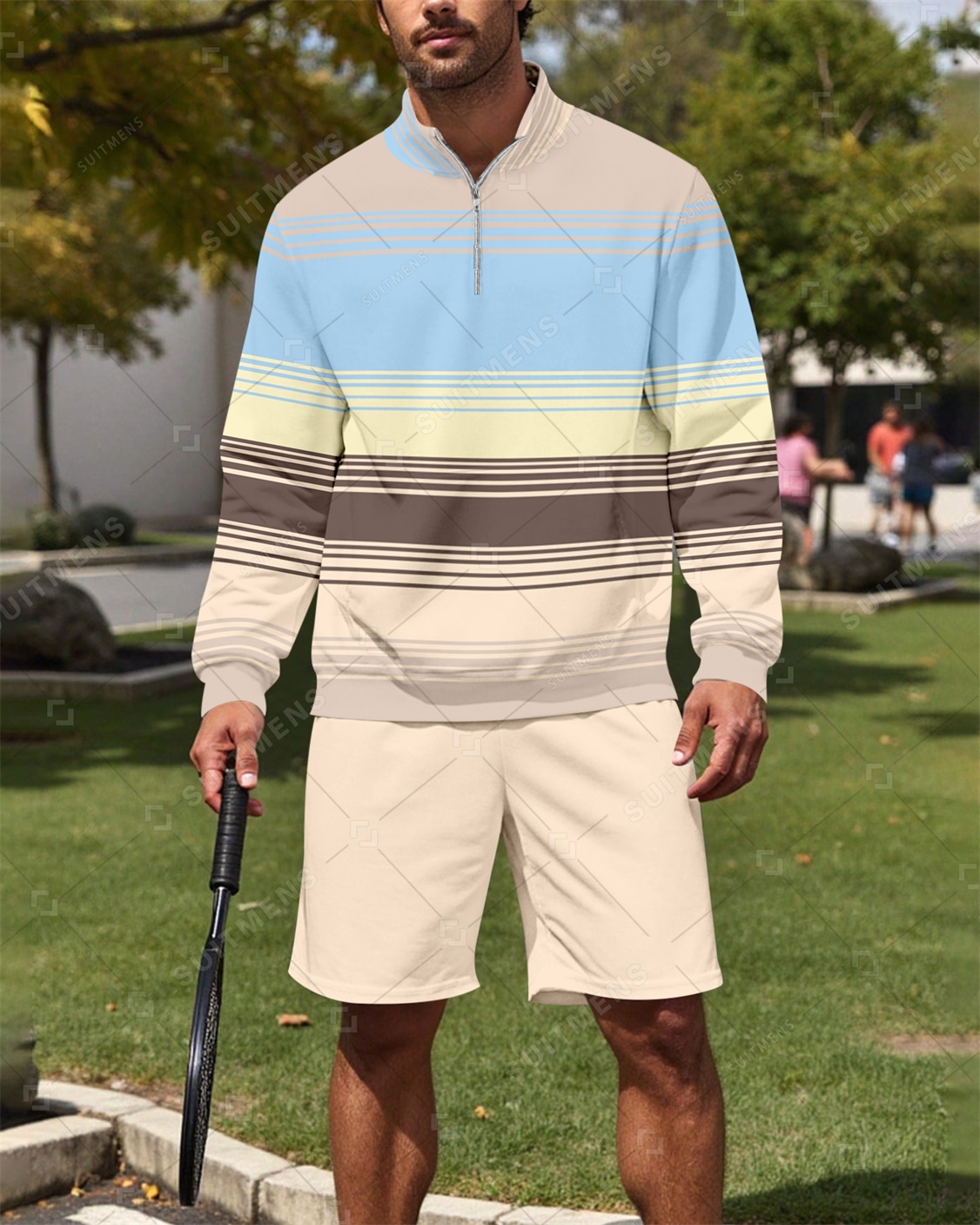 Men's Colorblock Striped Baseball Autumn Sweatshirt and Shorts Set 018