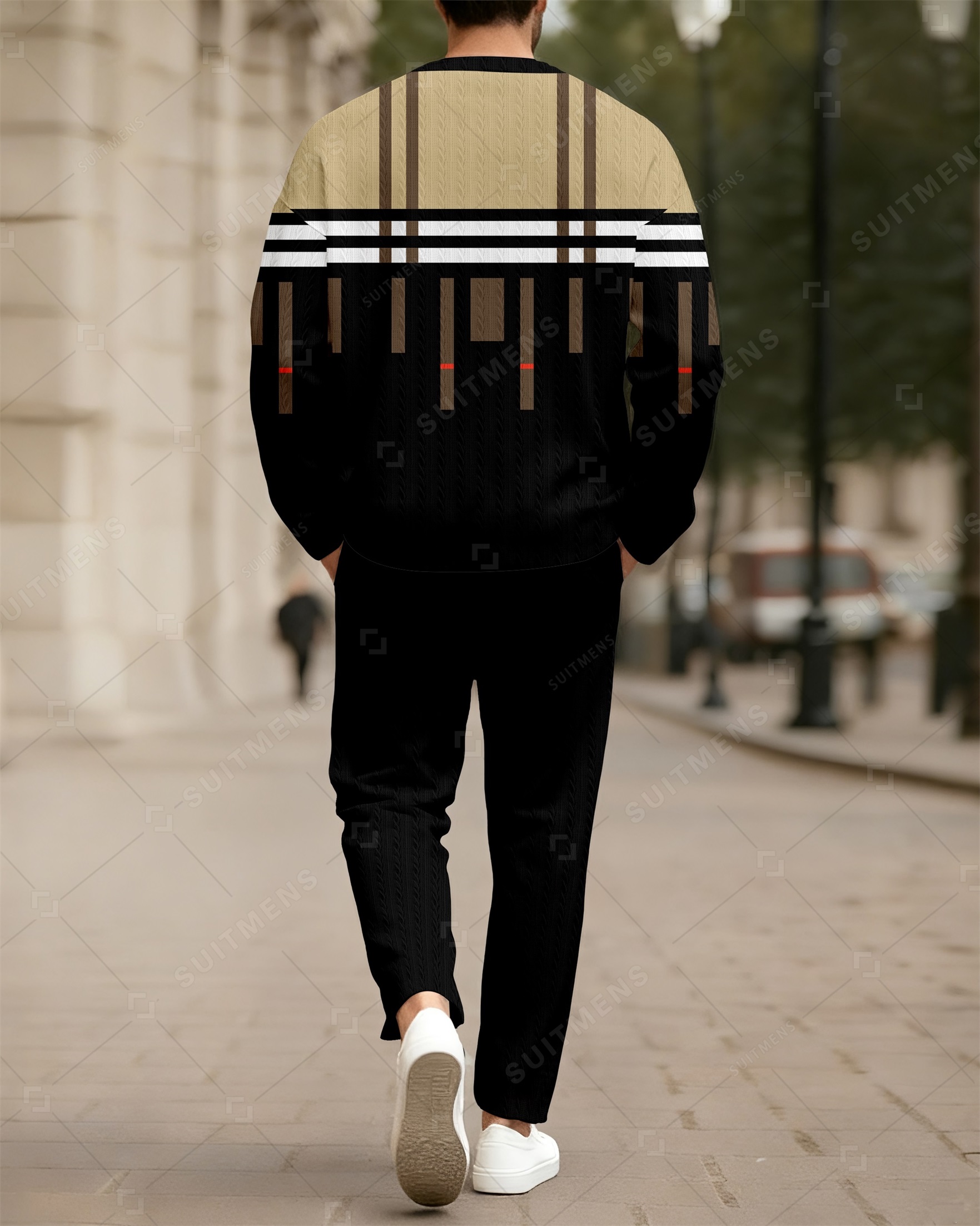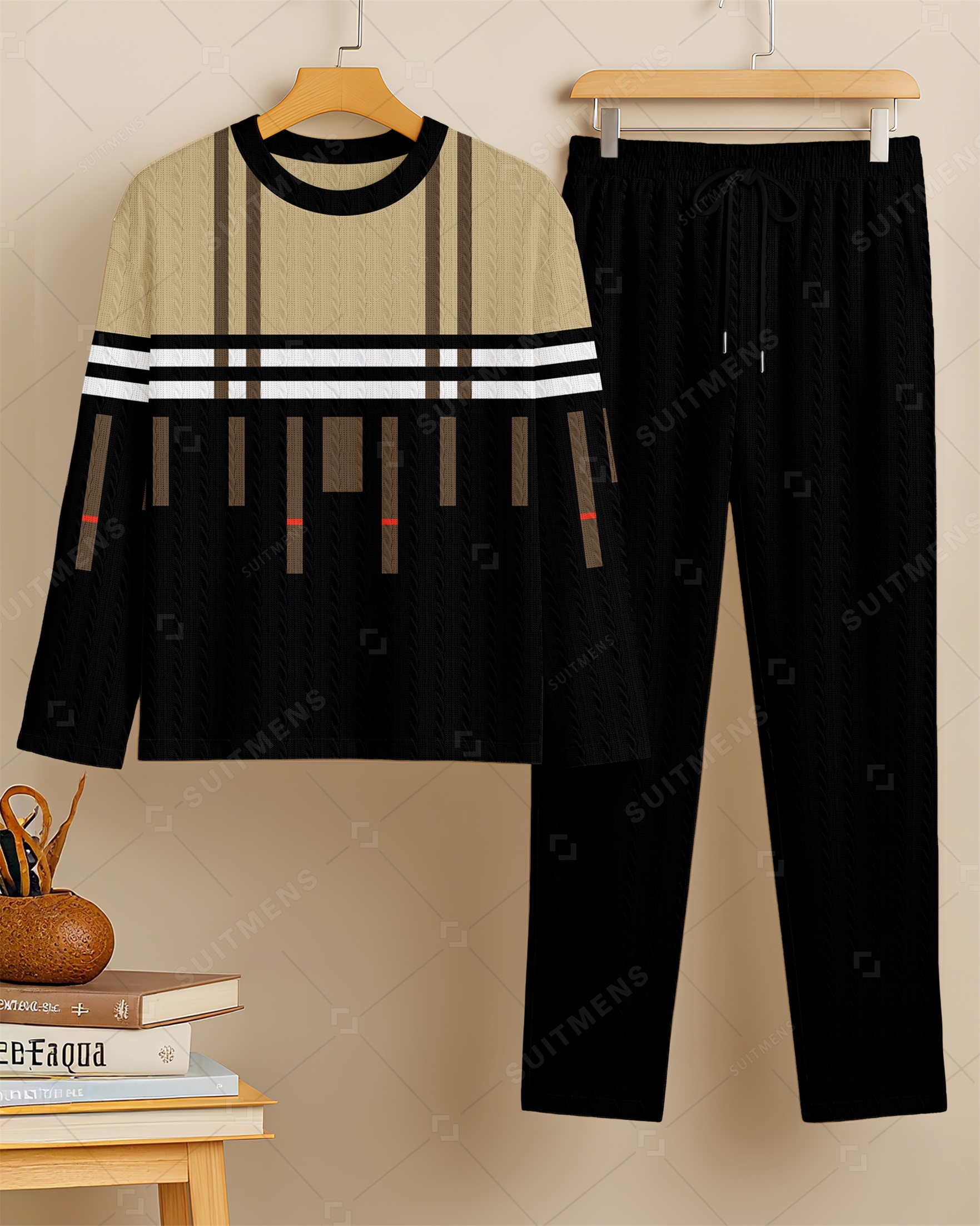Men's New Colorblock Print Textured Long Sleeve Pants Set 009