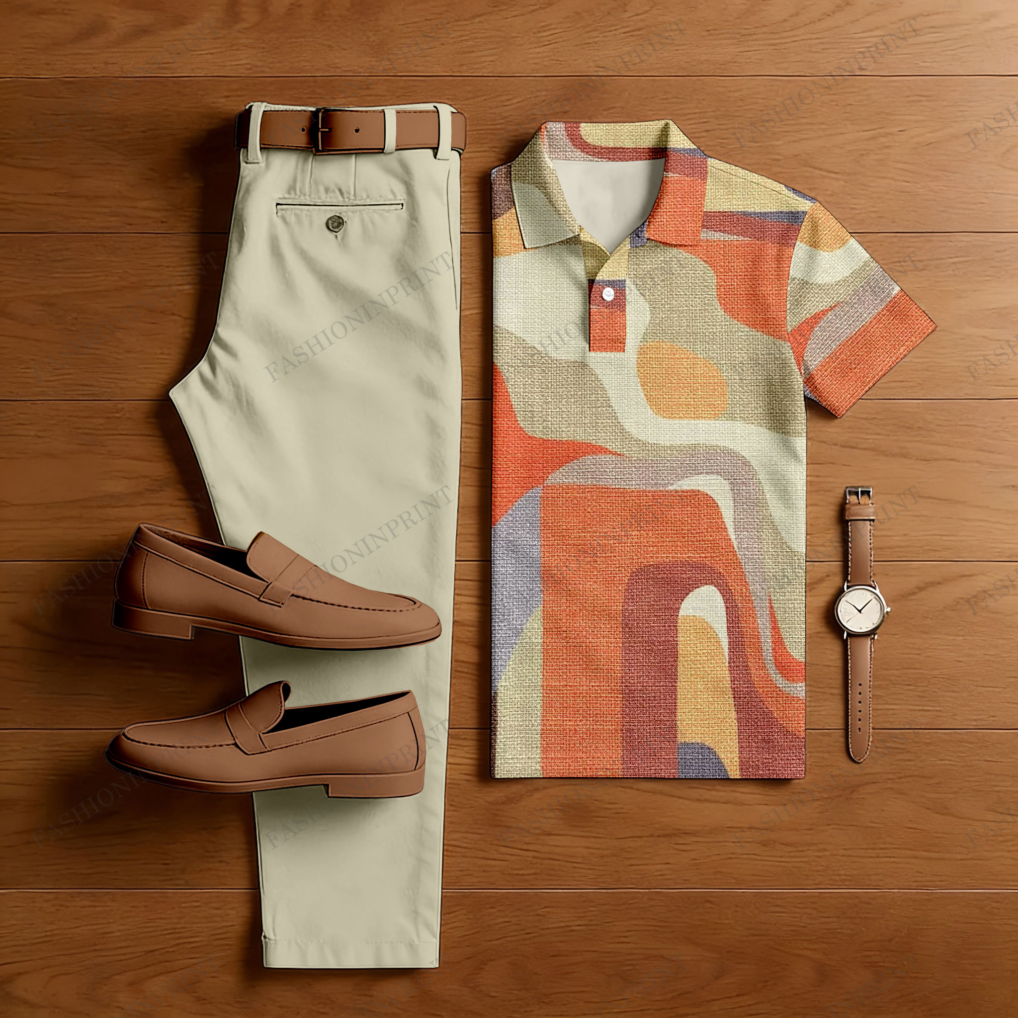 Men's Casual Khaki & Orange Color Matching Printed Short Sleeved Polo Shirt & Trousers Two-Piece Set