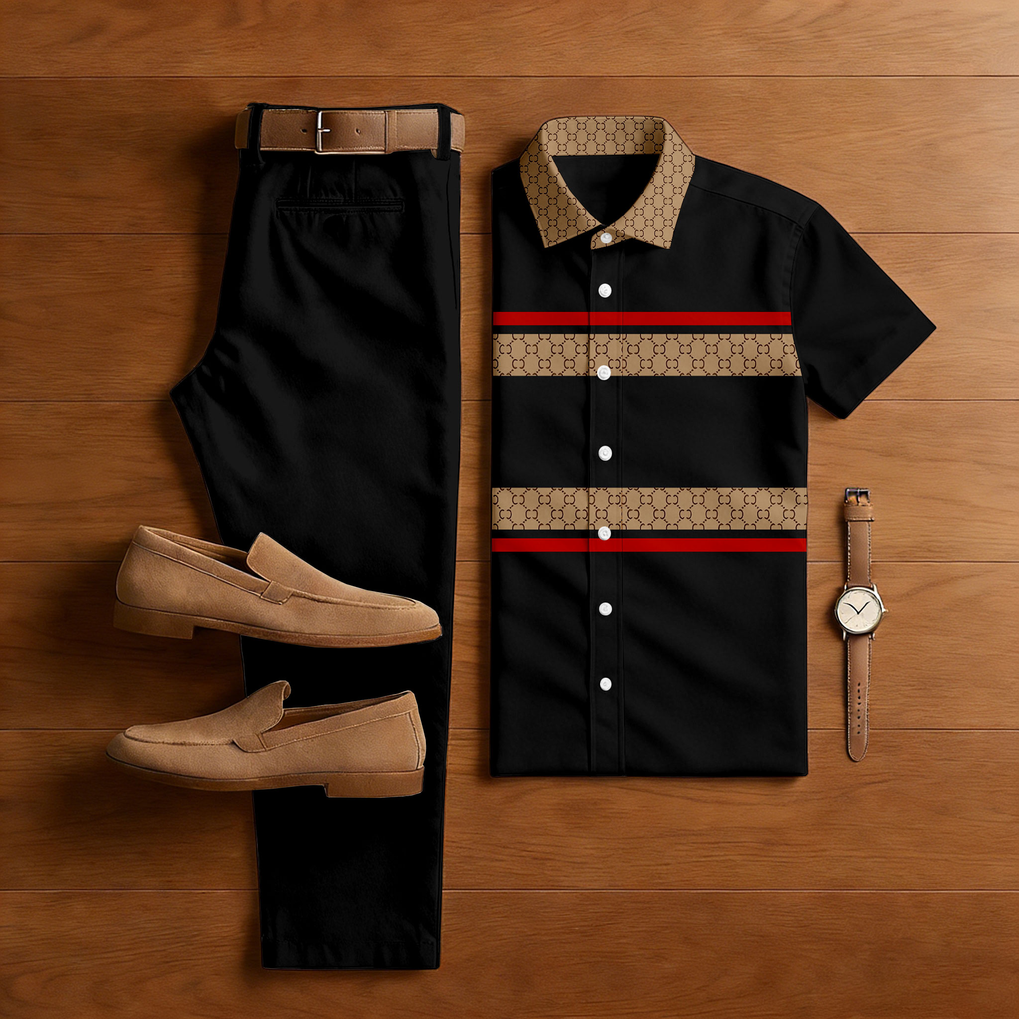 Men's Casual Color Matching Print Short-Sleeve Shirt & Trousers Two-Piece Set