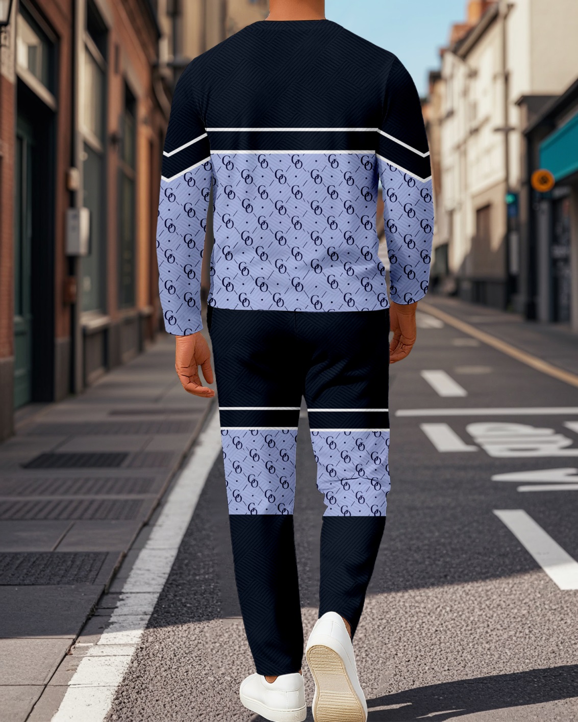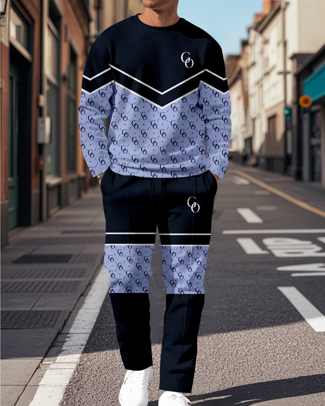 Men's Colorblock Printed Textured Long Sleeve -Sleeved Trousers Suit 043
