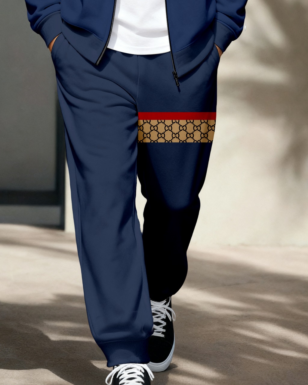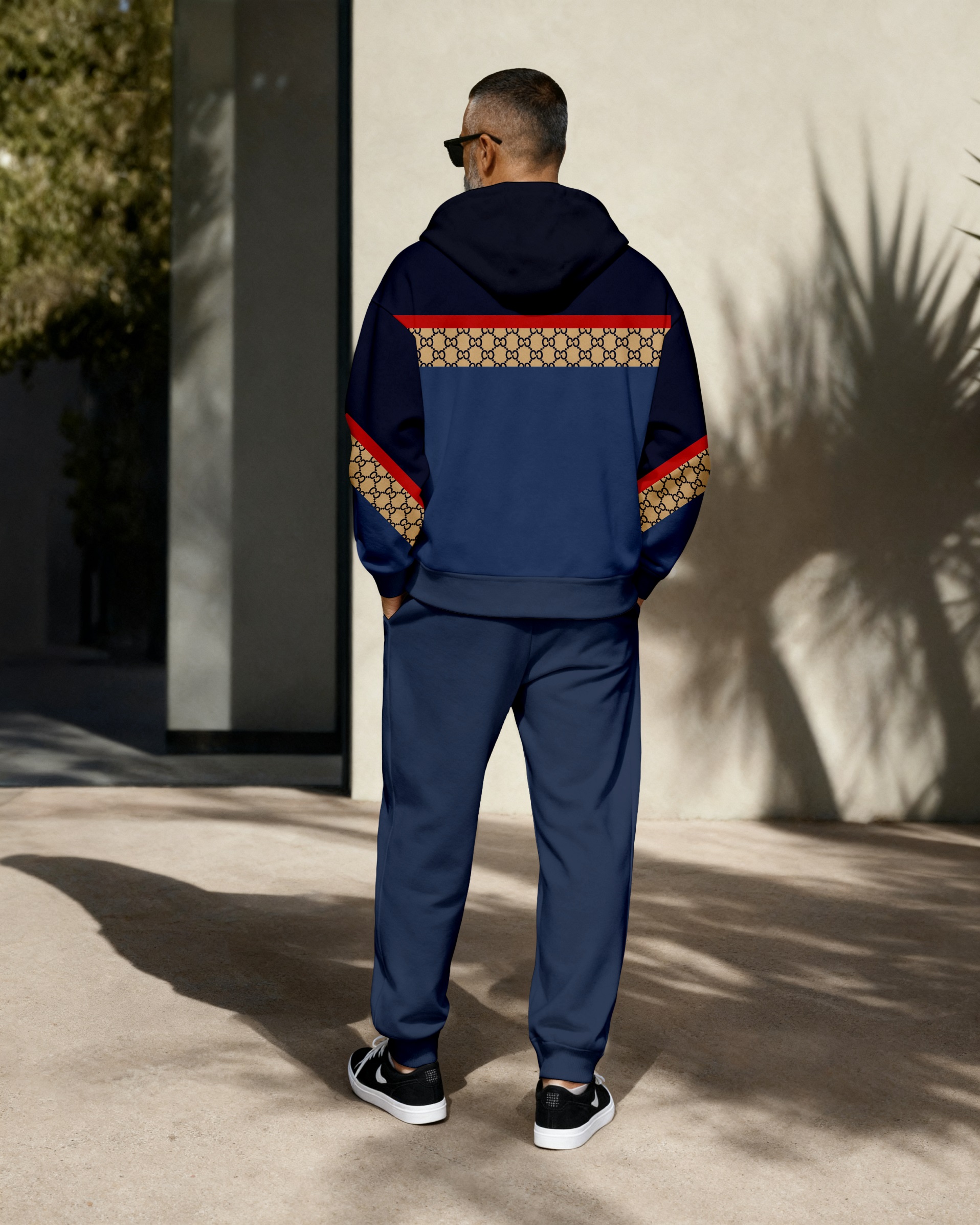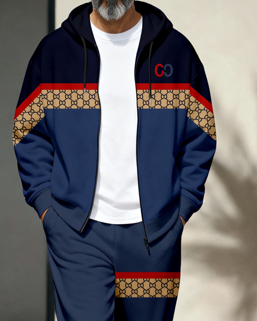Men's Retro Luxury Thickened Fleece Colorblock Jacket Sports Hoodie Set 09