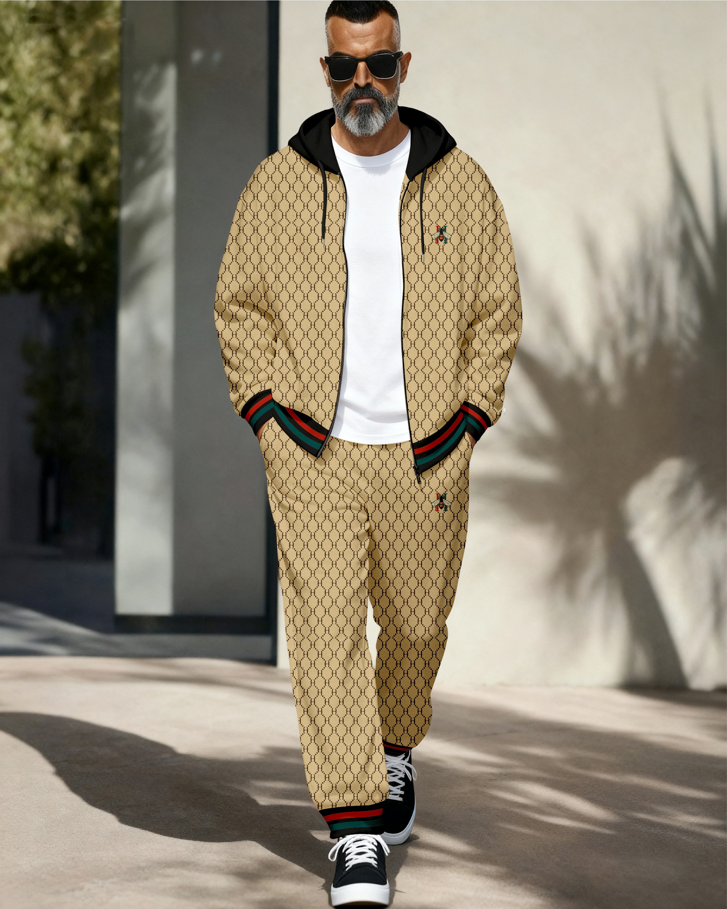 Men's Retro Luxury Thickened Fleece Colorblock Jacket Sports Hoodie Set 01