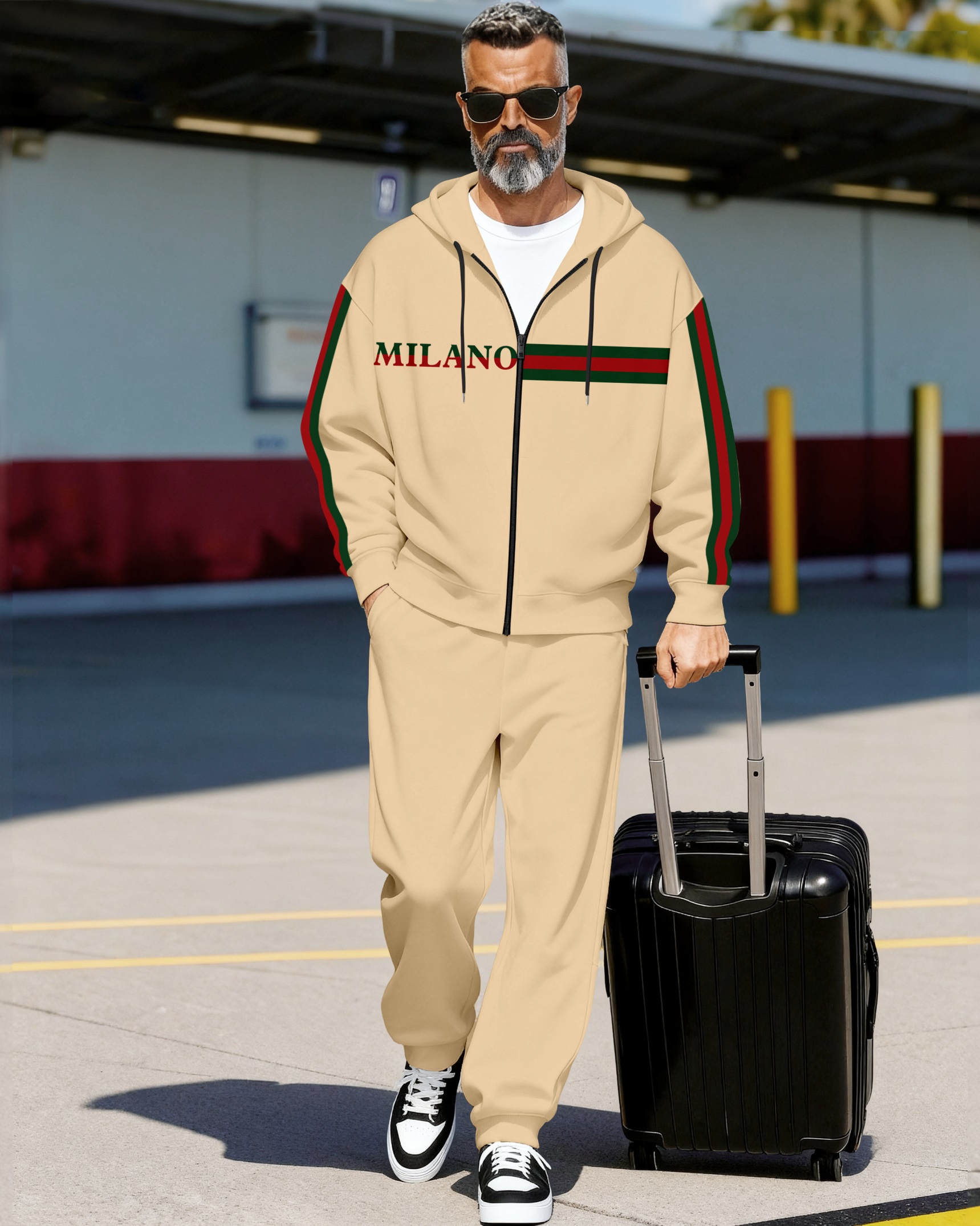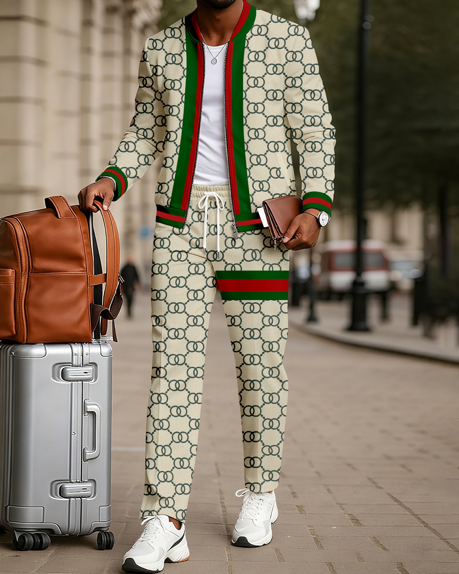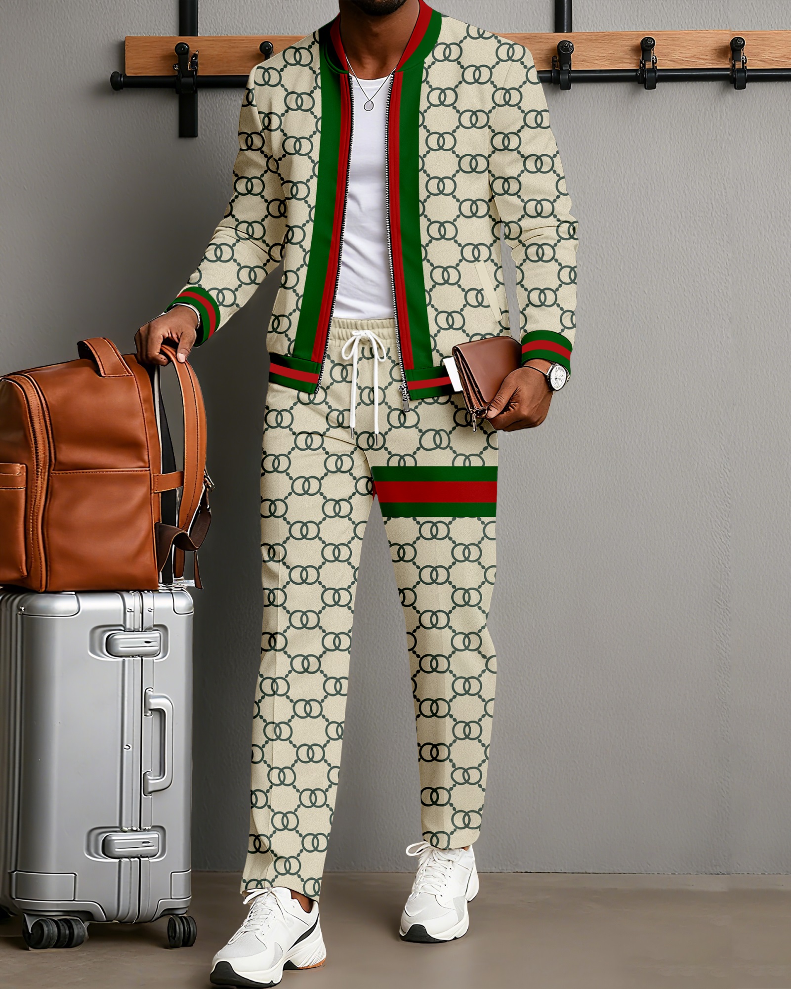 Men's fashionable khaki striped print zipper long-sleeved two-piece set
