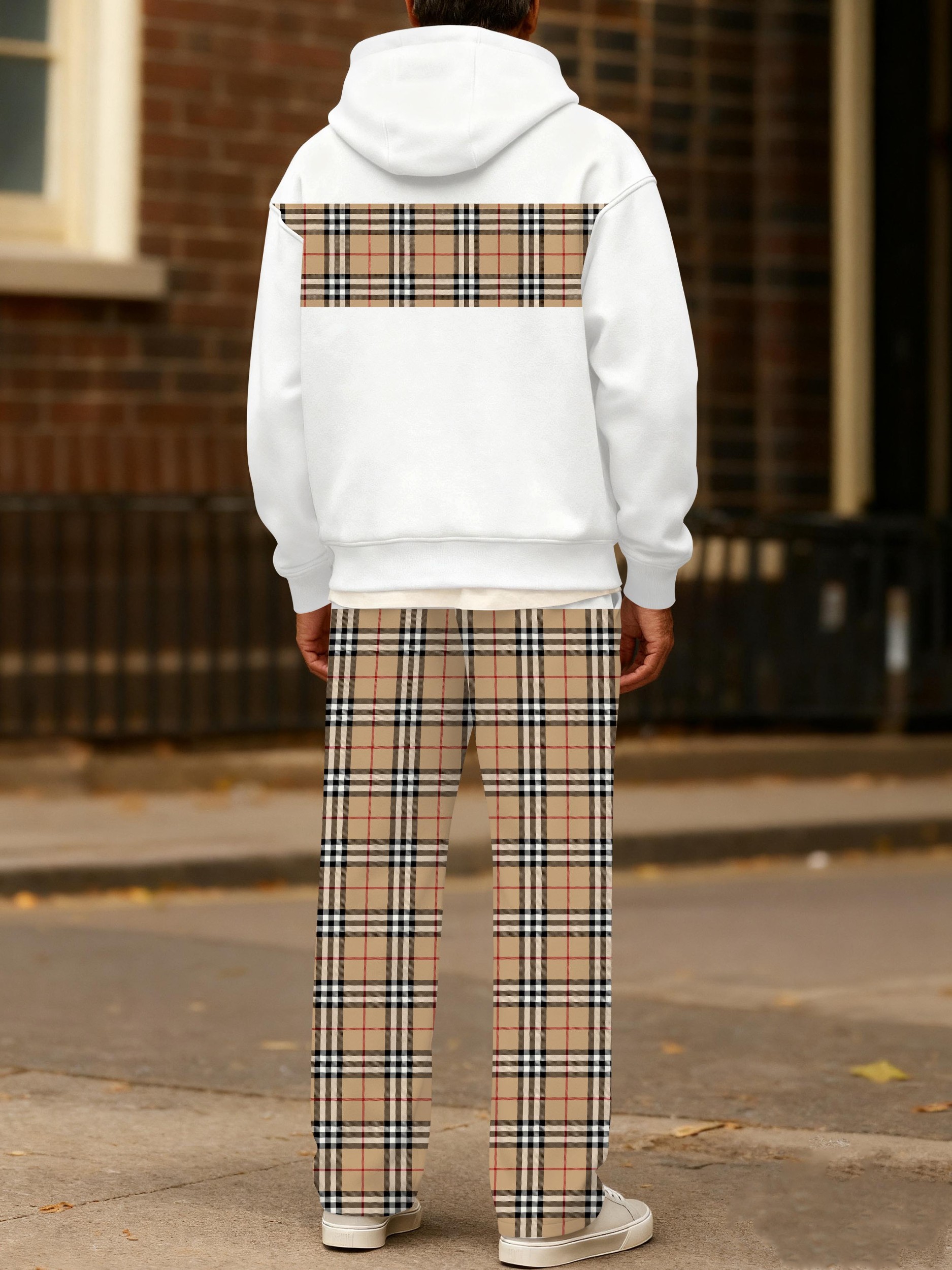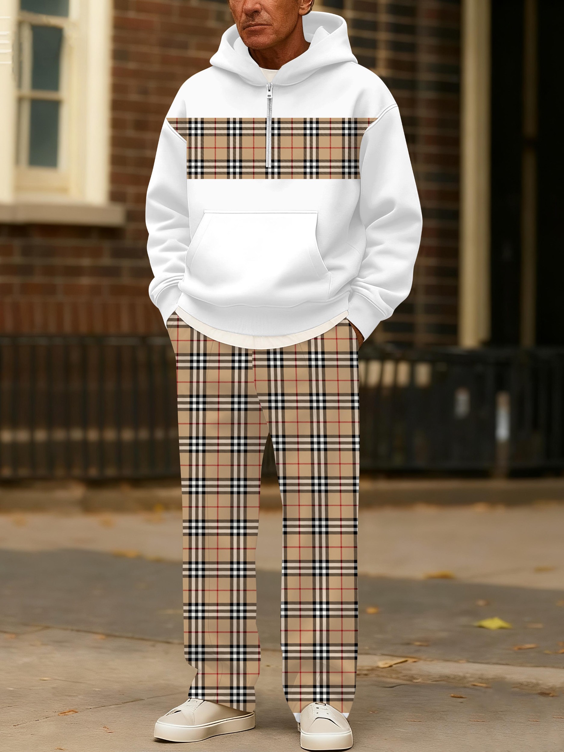 Men's stylish casual khaki checkered printed hoodie set