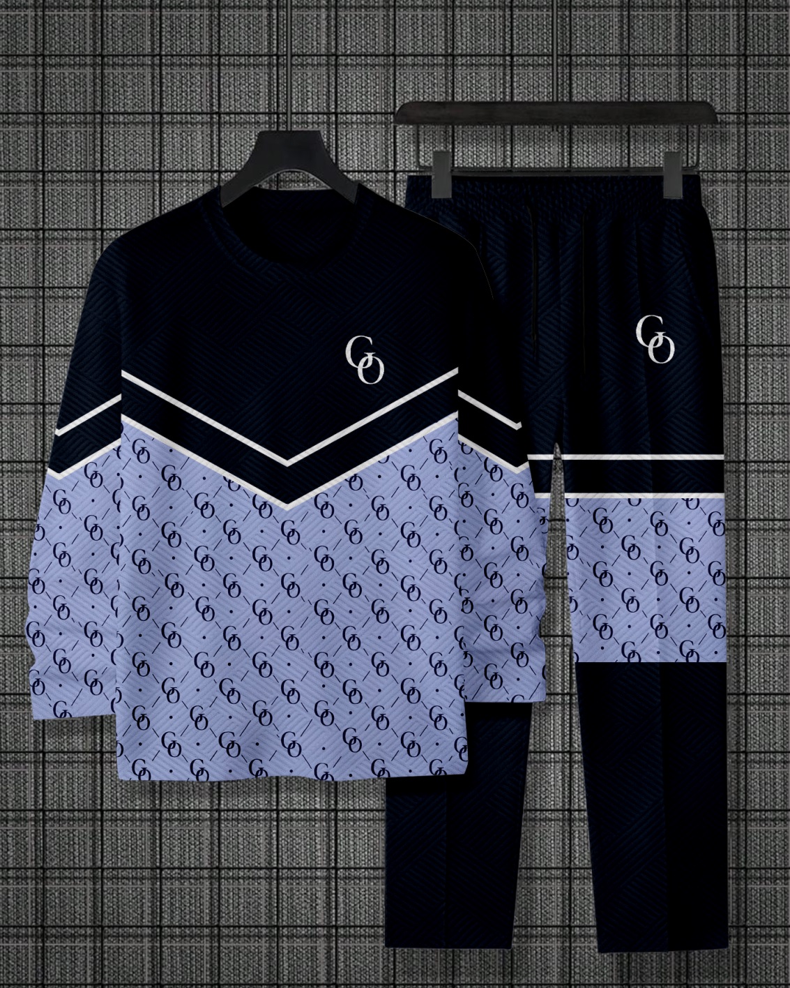 Men's Colorblock Printed Textured Long Sleeve -Sleeved Trousers Suit 041