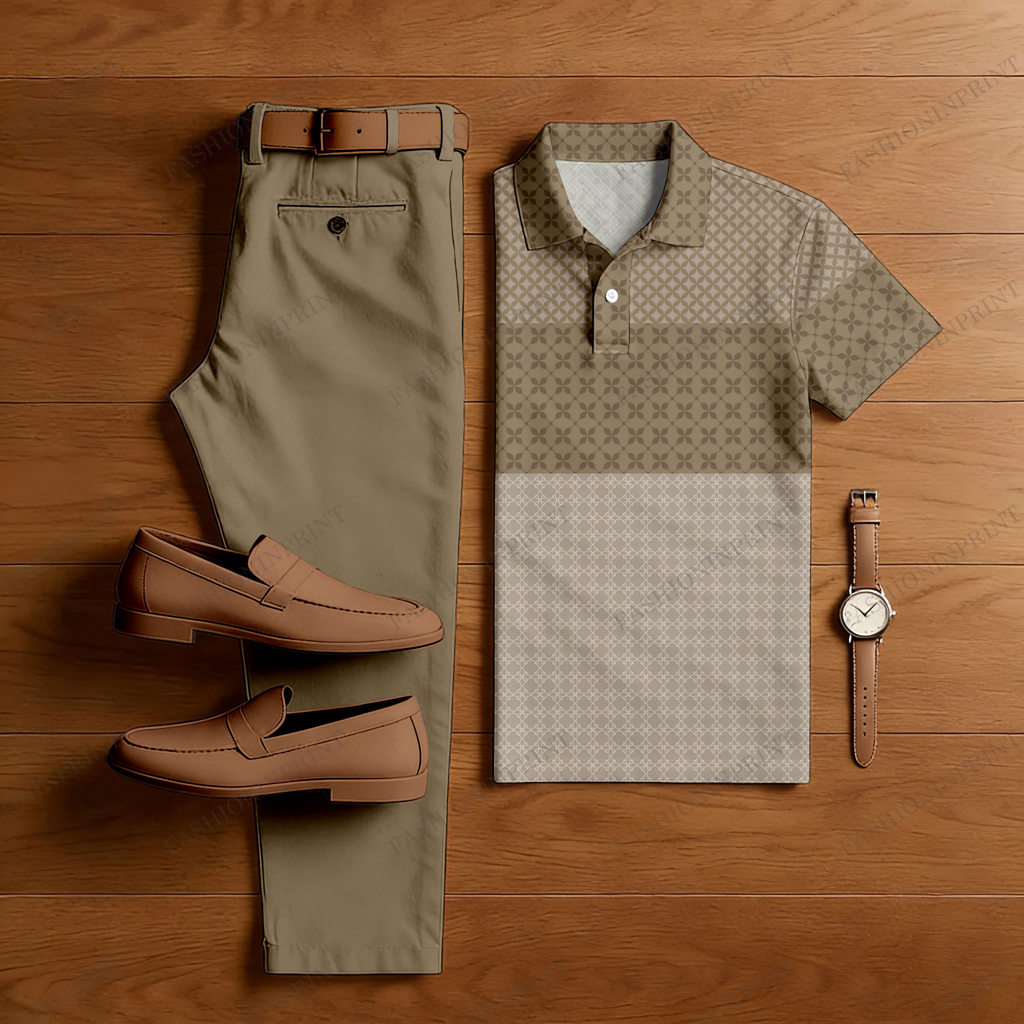 Men's Casual Brown Color Matching Retro Style Checkered Printed Short Sleeved Polo Shirt & Trousers Two-Piece Set