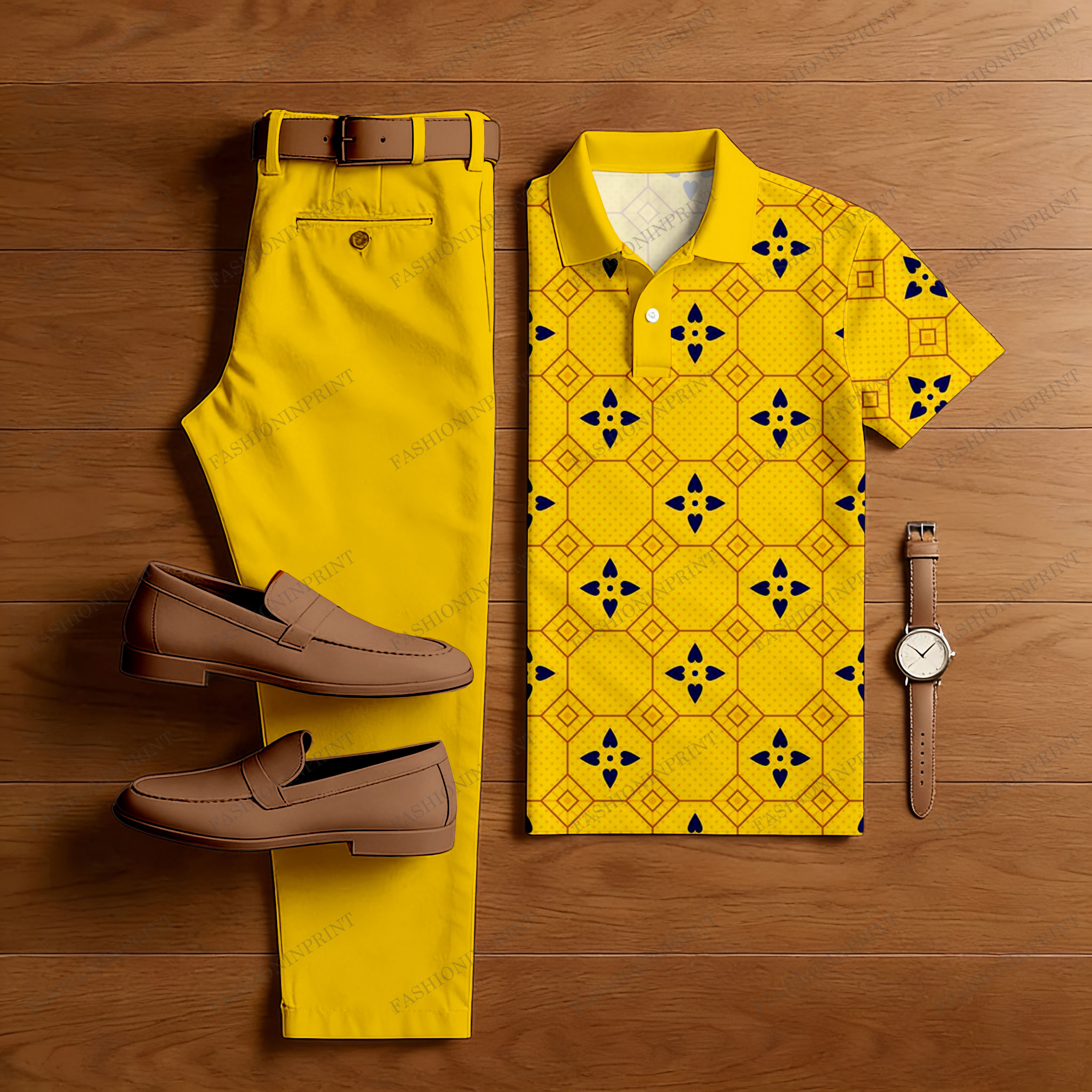 Men's Casual Yellow Color Matching Retro Flower Checkered Printed Short Sleeved Polo Shirt & Trousers Two-Piece Set