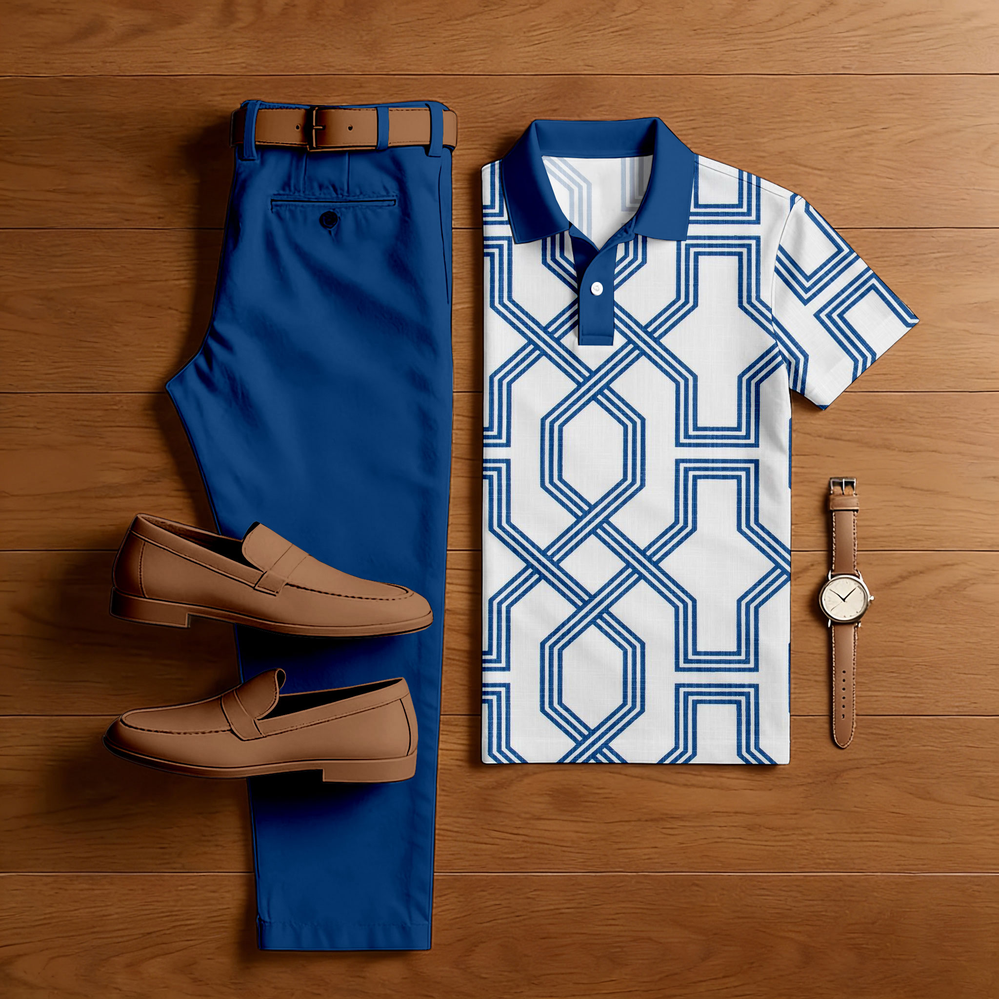 Men's Casual Blue & White Color Matching Retro Style Printed Short Sleeved Polo Shirt & Trousers Two-Piece Set
